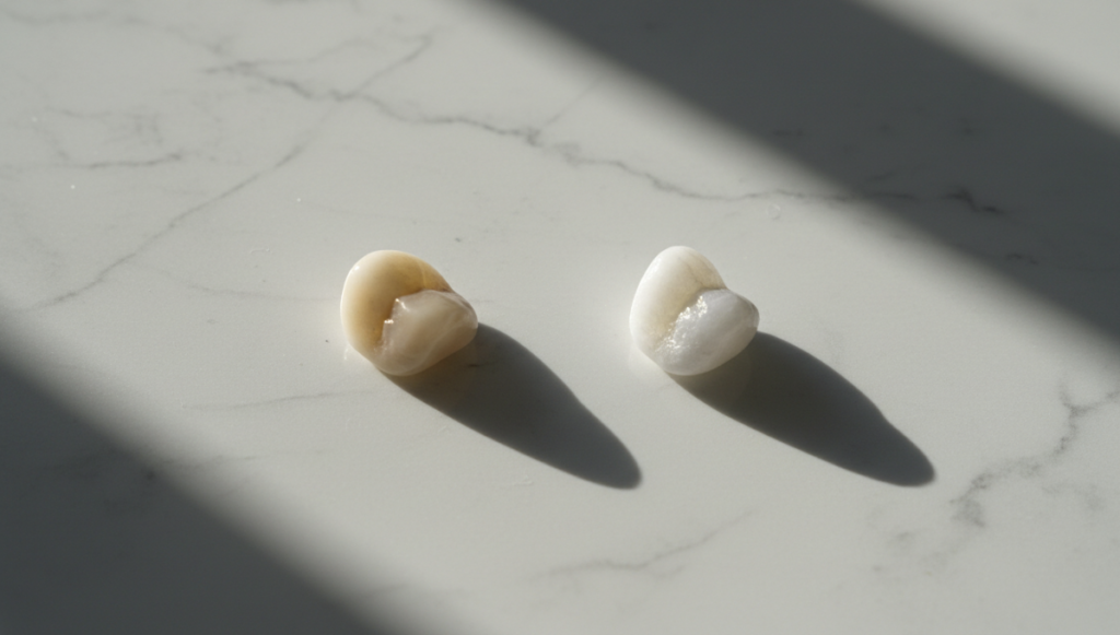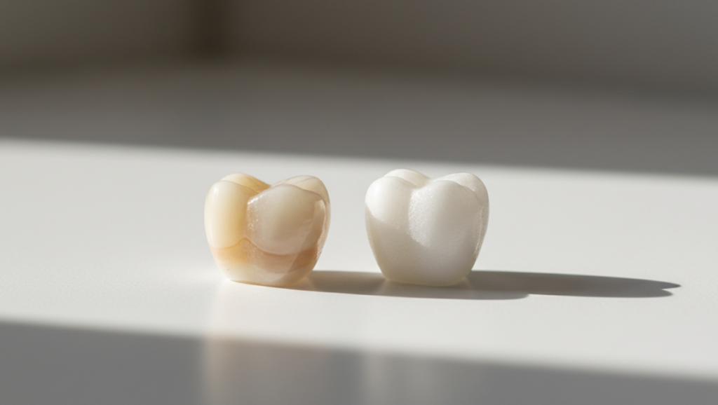 一方、セラミックなどの白い被せ物は経年劣化が起きにくく、歯と被せ物の間に隙間が生じにくいのが特徴です。さらに、傷がつきにくくツルツルとした表面をしているので、プラークが付着しにくく、虫歯や歯周病のリスクを軽減できます。