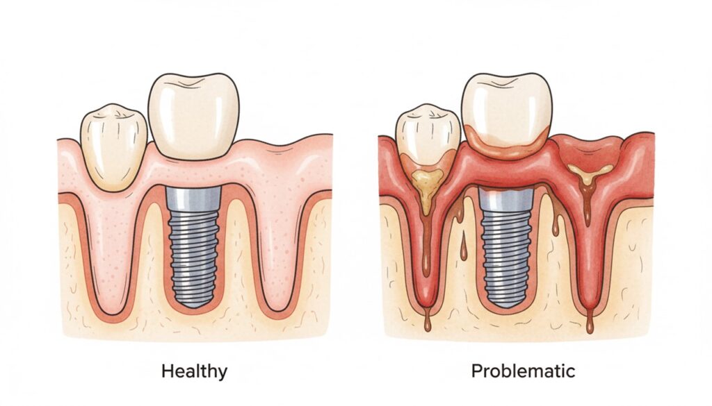 初期段階では歯ぐきの腫れや出血が見られ(インプラント周囲粘膜炎)、この状態であれば適切な治療を行えばほとんどが健全な歯ぐきの状態に回復します。